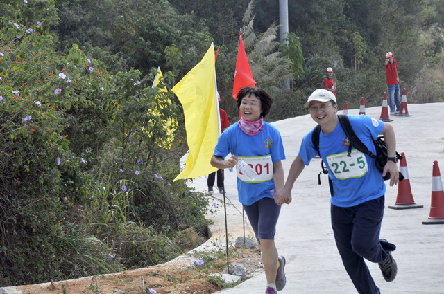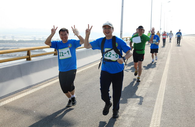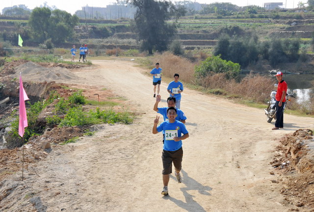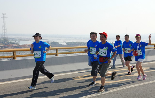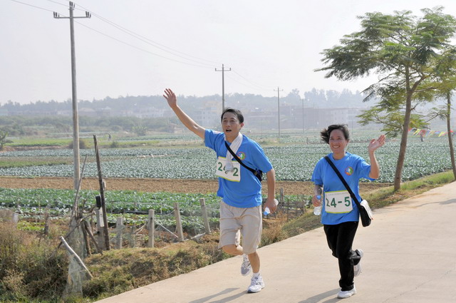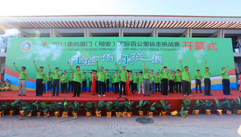 11月5日8時(shí)09分,明媚秋光里,廈門市委常委、副市長(zhǎng)臧杰斌宣布2011象嶼廈門(翔安)國(guó)際百公里縱走挑戰(zhàn)賽開始,廈門市人大常委會(huì)副主任黃杰成、廈門市政協(xié)副主席陳昌生、國(guó)家奧林匹克體育中心副主任彭維勇、象嶼集團(tuán)總裁張水利等一起為比賽鳴槍。來(lái)自28個(gè)國(guó)家和地區(qū)的近萬(wàn)名運(yùn)動(dòng)愛好者,從大嶝小鎮(zhèn)·臺(tái)灣免稅公園廣場(chǎng)出發(fā),穿越田野、海濱、山巒、閩南古厝,開始了一段挑戰(zhàn)自我的征途。這其中,由象嶼集團(tuán)員工及家屬、合作伙伴、共建單位等組成的千人象嶼團(tuán)隊(duì)分外引人注目,浩浩蕩蕩的象嶼人走在一起、樂在一起,在欣賞沿途自然、人文風(fēng)光的同時(shí),也享受著挑戰(zhàn)自我、永不止步的健康向上,享受著與同事、親朋共度美好秋假的怡然歡樂。