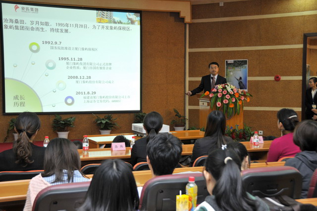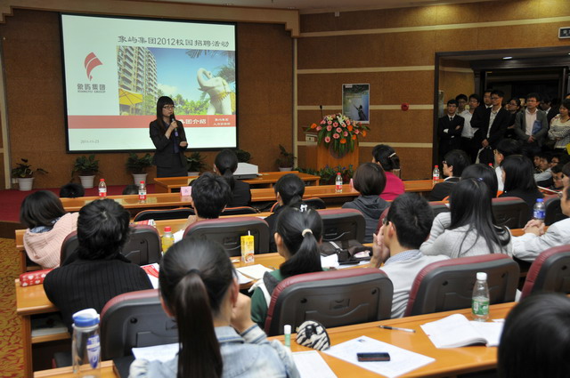 2012年象嶼集團(tuán)全國校園招聘首場(chǎng)宣講會(huì)于11月23日晚在廈門大學(xué)拉開帷幕。集團(tuán)人力資源總監(jiān)林志勇、象嶼股份人力資源部經(jīng)理林焱為同學(xué)們進(jìn)行了精彩的宣講并回答了同學(xué)們現(xiàn)場(chǎng)的提問,鼓勵(lì)廈大的優(yōu)秀學(xué)子們加入到象嶼的大家庭。據(jù)悉,此次宣講會(huì)吸引了近500位應(yīng)屆生參加,場(chǎng)面火爆,提問環(huán)節(jié)積極踴躍,會(huì)后現(xiàn)場(chǎng)收到簡(jiǎn)歷近500 份。