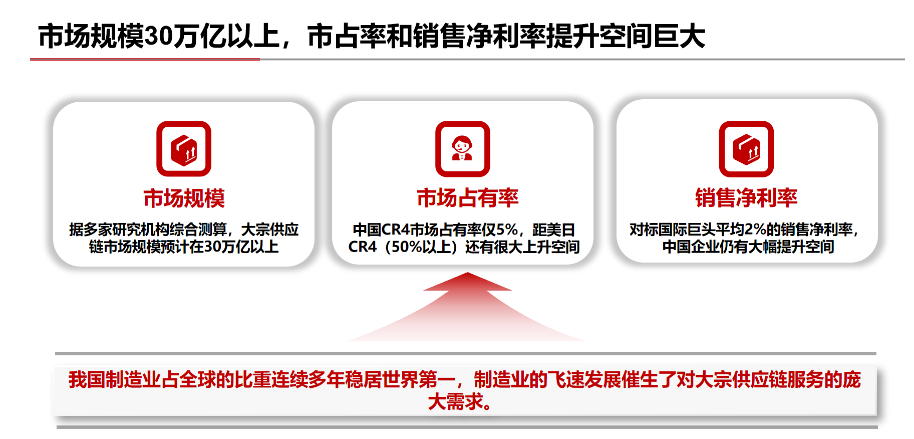 制造業(yè)企業(yè)日益專業(yè)化,對供應(yīng)鏈服務(wù)的需求從簡單追求成本,轉(zhuǎn)變?yōu)楦非笮?,市場亟需?span style="color: rgb(239, 25, 25); box-sizing: border-box;">提供“一攬子”服務(wù)、具備效率優(yōu)勢的大宗供應(yīng)鏈服務(wù)商。