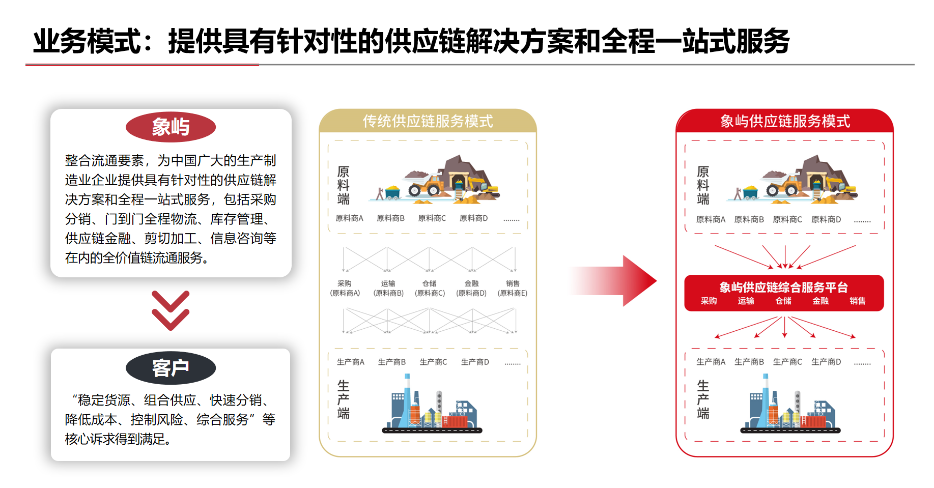 豐富多元、成熟穩(wěn)定的全球化業(yè)務(wù)渠道體系;覆蓋全國、連接海外的網(wǎng)絡(luò)化物流服務(wù)體系;正在構(gòu)建、初步成型的智能化信息科技體系;準確識別、日趨完善的全面風險管控體系;市場化、專業(yè)化的供應(yīng)鏈服務(wù)團隊。