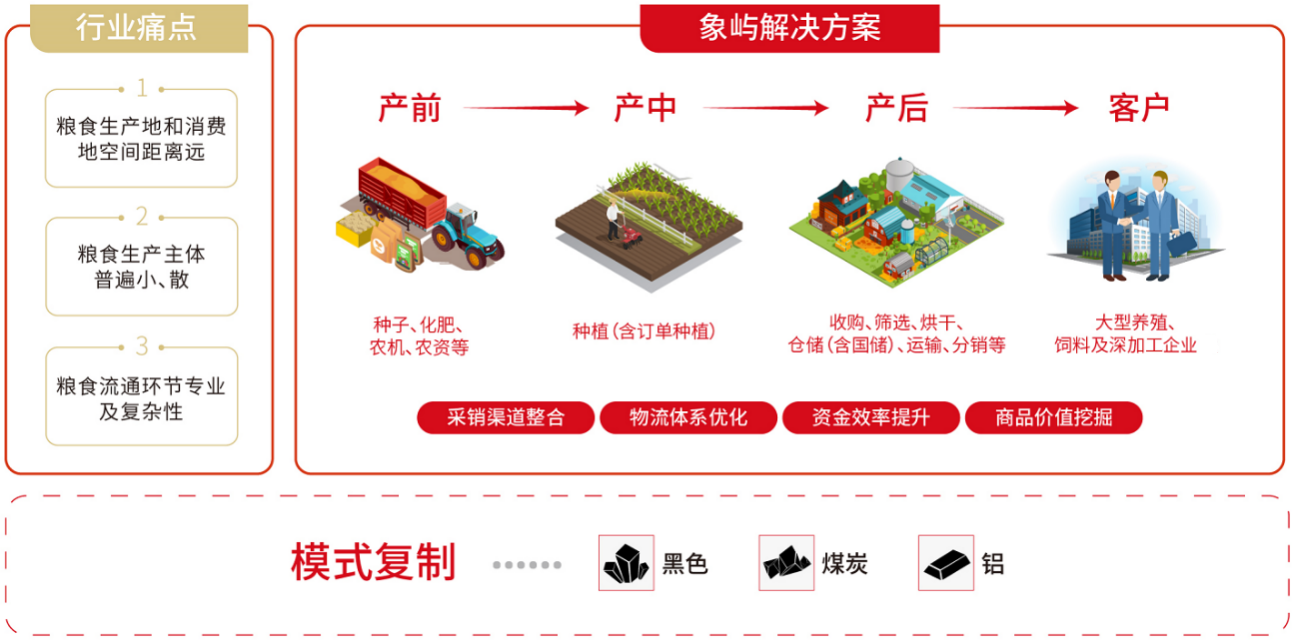 今年初,象嶼聯(lián)手阿里云結(jié)合東北農(nóng)業(yè)實際,攜手在糧食板塊先行先試建設(shè)農(nóng)業(yè)產(chǎn)業(yè)級互聯(lián)網(wǎng)平臺。該平臺將貫穿糧食產(chǎn)業(yè)鏈種植、倉儲、流通三大環(huán)節(jié),借助物聯(lián)網(wǎng)、云計算、區(qū)塊鏈手段實現(xiàn)輕資產(chǎn)模式下倉容快速擴張,連接用糧方、金融、物流等生態(tài)方,提升全產(chǎn)業(yè)鏈貿(mào)易、物流與金融效率。 未來,象嶼農(nóng)產(chǎn)將做深“一條鏈”,做大“一個園”,形成共創(chuàng)共享共贏的全產(chǎn)業(yè)鏈資源生態(tài)系統(tǒng),圍繞“雙循環(huán)”發(fā)展格局,進一步優(yōu)化投資結(jié)構(gòu),延伸投資鏈條,創(chuàng)新產(chǎn)業(yè)模式,為鄉(xiāng)村振興、促進農(nóng)業(yè)高質(zhì)高效發(fā)展貢獻力量!