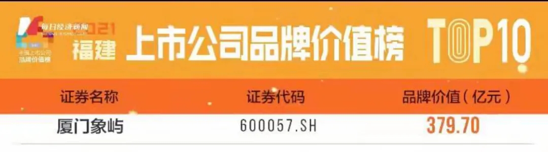 近日,由每日經(jīng)濟(jì)新聞主辦的“2021中國(guó)上市公司品牌價(jià)值藍(lán)皮書(shū)發(fā)布暨中國(guó)資本市場(chǎng)年度榮譽(yù)盛典”成功舉辦。廈門(mén)象嶼繼此前入圍“2021中國(guó)上市公司品牌價(jià)值活力榜TOP 100”后,再次入圍“2021福建上市公司品牌價(jià)值榜TOP 10”,品牌價(jià)值高達(dá)379.70億元,同時(shí)公司董事會(huì)秘書(shū)廖杰榮獲“2021最佳主板上市公司董秘”。