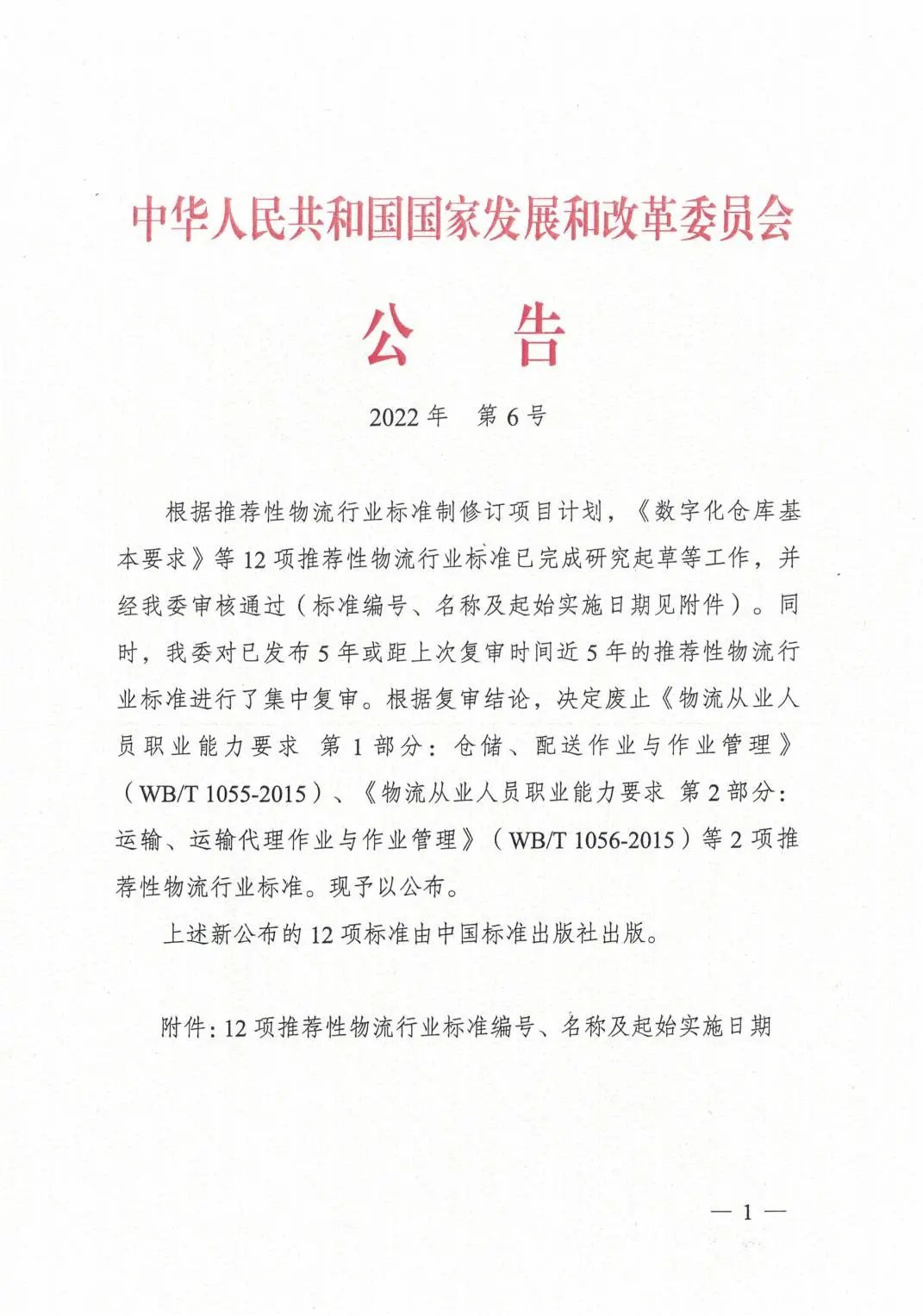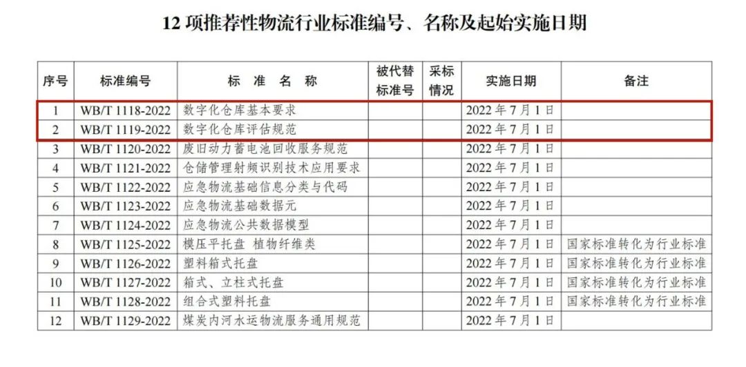 近日,中華人民共和國國家發(fā)展和改革委員會印發(fā)了2022年第6號公告,批準(zhǔn)發(fā)布12項推薦性物流行業(yè)標(biāo)準(zhǔn)。其中,由廈門象嶼股份有限公司參與編寫的《數(shù)字化倉庫基本要求》(WB/T 1118-2022)《數(shù)字化倉庫評估規(guī)范》(WB/T 1119-2022)2項推薦性物流行業(yè)標(biāo)準(zhǔn)于2022年7月1日正式實施。